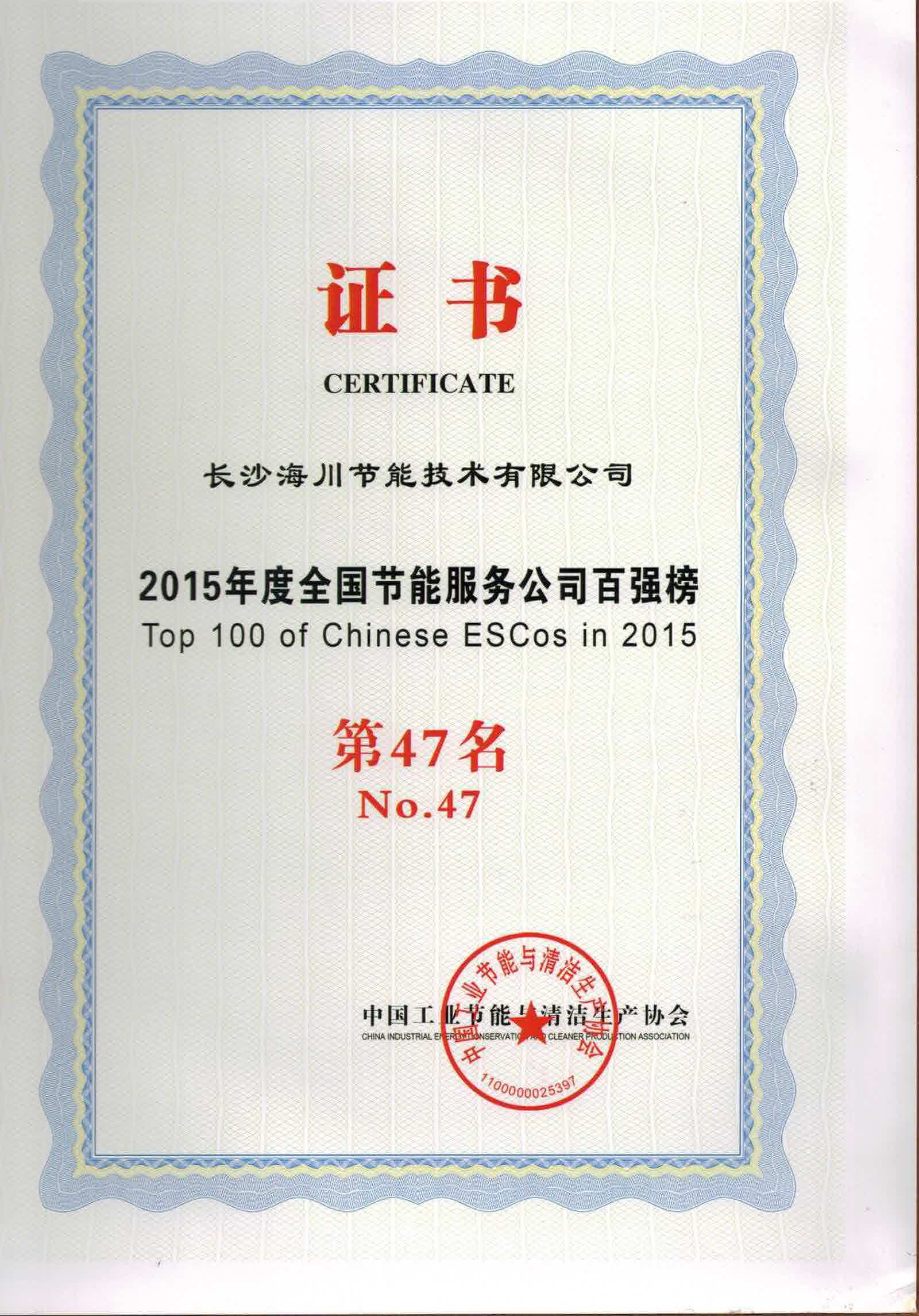 2015年12月,“中國(guó)節(jié)能服務(wù)產(chǎn)業(yè)發(fā)展論壇暨2015中國(guó)節(jié)能服務(wù)公司百?gòu)?qiáng)榜發(fā)布會(huì)”在四川成都舉行,中國(guó)工業(yè)節(jié)能與清潔生產(chǎn)協(xié)會(huì)發(fā)布了2015年度中國(guó)節(jié)能服務(wù)公司百?gòu)?qiáng)榜榜單及研究報(bào)告。山水集團(tuán)下屬分公司海川節(jié)能以豐富的節(jié)能成果,榮獲2015全國(guó)節(jié)能服務(wù)百?gòu)?qiáng)企業(yè)。