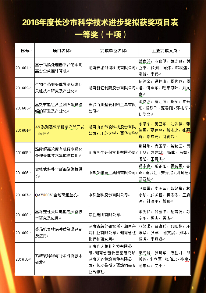 近日,2016年度長(zhǎng)沙市科學(xué)技術(shù)進(jìn)步獎(jiǎng)獲獎(jiǎng)項(xiàng)目已全部揭曉。湖南山水節(jié)能科技股份有限公司攜《AS系列高效節(jié)能泵產(chǎn)品開(kāi)發(fā)與應(yīng)用》項(xiàng)目喜獲長(zhǎng)沙市科學(xué)技術(shù)進(jìn)步獎(jiǎng)一等獎(jiǎng),是此次水泵行業(yè)少有殊榮的企業(yè)。