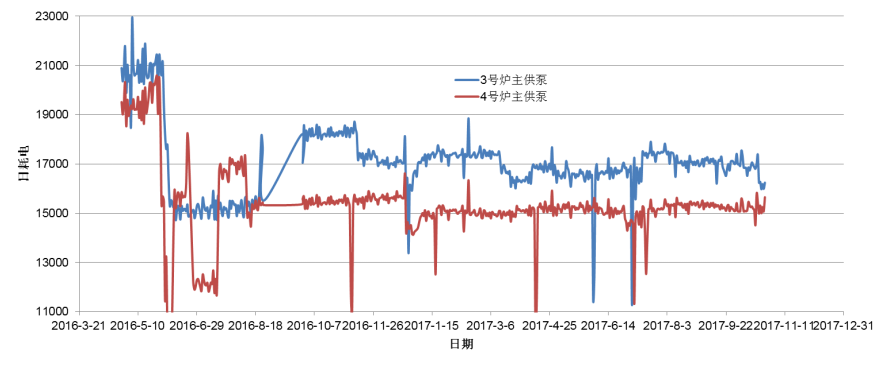 圖2 3號爐主供泵和4號爐主共泵耗電每日走勢圖(對比)
