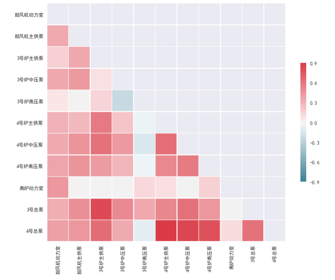 每日電耗相關(guān)性分析,主要用于分析具有相互關(guān)系的兩個泵站(通常屬于同一個管網(wǎng),如同一高爐對應(yīng)的主供泵與中/高壓泵)電耗的相關(guān)性,從而交叉對比以了解各泵之間電耗的相互關(guān)系,如圖7所示。
