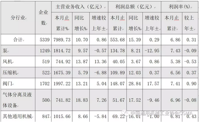 據行業對153家重點企業統計,共完成工業總產值829.32億元,同比增長8.58%,較上年回落2.87個百分點;實現營業收入827.25億元,同比增長9.57%,較上年回落2.29個百分點;實現利潤總額62.25億元,同比增長8%,較上年大幅回落。累計訂貨量970.18億元,同比增長8.1%,較上年回落9.61個百分點。應收賬款同比增長3.77%,較上年提升3.56個百分點;產成品庫存同比增長25.67%,較上年提升14.69個百分點。據國家統計局數據顯示,截至2018年末,通用機械行業規模以上企業5339家,擁有資產總計7836.96億元,同比增長7.3%,實現主營業務收入7989.73億元,同比增長10.7%;利潤總額553.68億元,同比增長15.1%,出口交貨值1114.62億元同比增長9.11%。