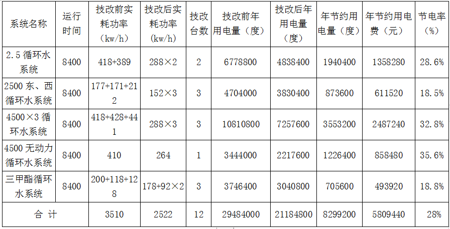 技改效果:通過(guò)對(duì)南通江山農(nóng)藥化工股份有限公司循環(huán)水系統(tǒng)的現(xiàn)場(chǎng)調(diào)研分析,系統(tǒng)目前年耗電量約為2948萬(wàn)度,預(yù)計(jì)技改后年耗電量為2118萬(wàn)度,年節(jié)約用電量約829萬(wàn)度,節(jié)電率28 %,按照電價(jià)0.7元/度,可實(shí)現(xiàn)年節(jié)約電費(fèi)約580萬(wàn)元。